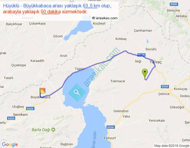 Hüyüklü - Büyükkabaca arası yaklaşık olarak 90 km/h ile yukarıda belirtilen sürede olup, iki yerin kuş uçuşu uzaklığı (mesafesi) 43'dir. Yolculuk otobüsle 1 saat 5 dakika sürmektedir.