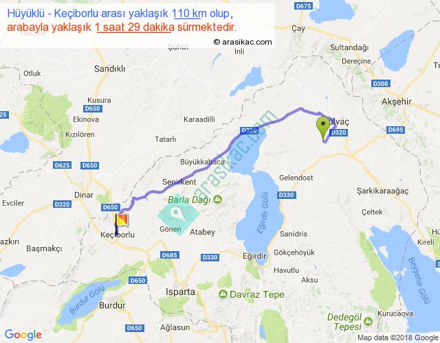 Hüyüklü - Keçiborlu arası yaklaşık olarak 90 km/h ile yukarıda belirtilen sürede olup, iki yerin kuş uçuşu uzaklığı (mesafesi) 79'dir. Yolculuk otobüsle 1 saat 55 dakika sürmektedir.