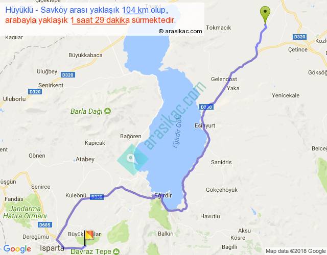 Hüyüklü - Savköy arası yaklaşık olarak 90 km/h ile yukarıda belirtilen sürede olup, iki yerin kuş uçuşu uzaklığı (mesafesi) 67'dir. Yolculuk otobüsle 1 saat 55 dakika sürmektedir.