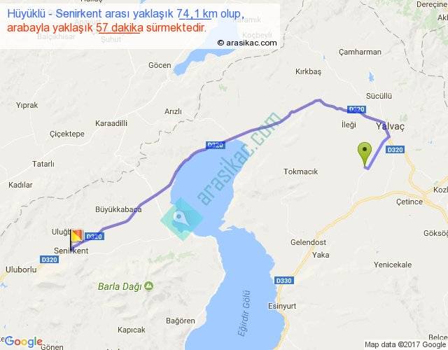 Hüyüklü - Senirkent arası yaklaşık olarak 90 km/h ile yukarıda belirtilen sürede olup, iki yerin kuş uçuşu uzaklığı (mesafesi) 52'dir. Yolculuk otobüsle 1 saat 14 dakika sürmektedir.