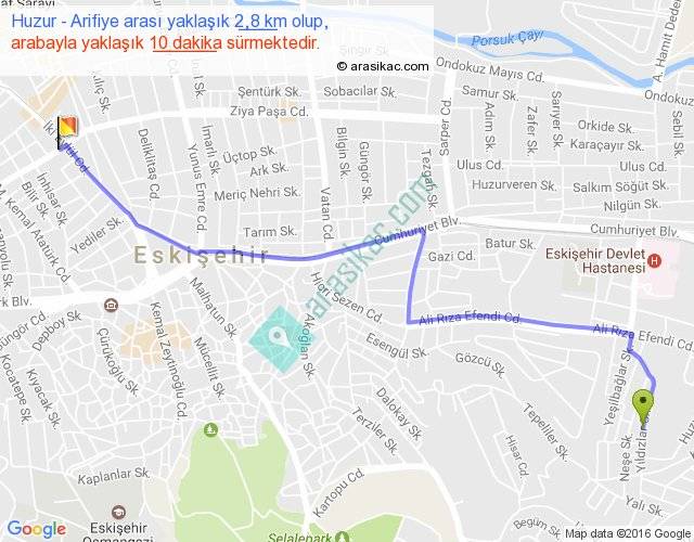 Huzur - Arifiye arası yaklaşık olarak 90 km/h ile yukarıda belirtilen sürede olup, iki yerin kuş uçuşu uzaklığı (mesafesi) 2'dir. Yolculuk otobüsle 13 dakika sürmektedir.