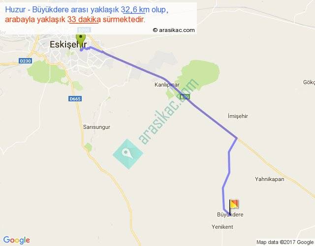 Huzur - Büyükdere arası yaklaşık olarak 90 km/h ile yukarıda belirtilen sürede olup, iki yerin kuş uçuşu uzaklığı (mesafesi) 26'dir. Yolculuk otobüsle 42 dakika sürmektedir.