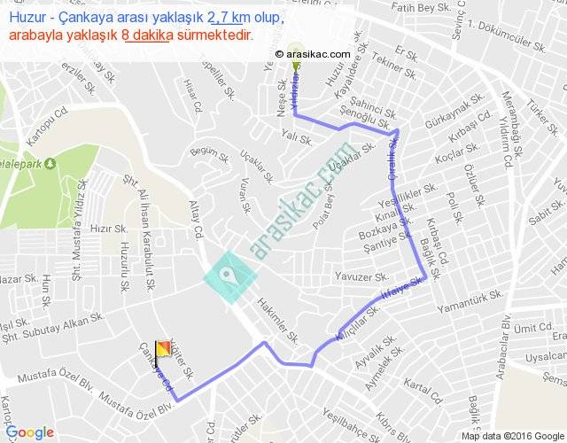 Huzur - Çankaya arası yaklaşık olarak 90 km/h ile yukarıda belirtilen sürede olup, iki yerin kuş uçuşu uzaklığı (mesafesi) 1'dir. Yolculuk otobüsle 10 dakika sürmektedir.