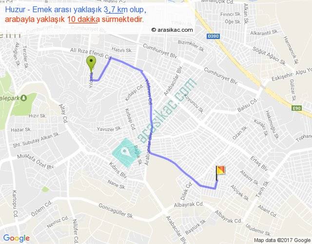 Huzur - Emek arası yaklaşık olarak 90 km/h ile yukarıda belirtilen sürede olup, iki yerin kuş uçuşu uzaklığı (mesafesi) 2'dir. Yolculuk otobüsle 13 dakika sürmektedir.