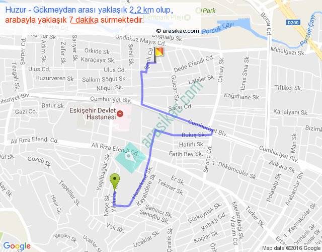 Huzur - Gökmeydan arası yaklaşık olarak 90 km/h ile yukarıda belirtilen sürede olup, iki yerin kuş uçuşu uzaklığı (mesafesi) 1'dir. Yolculuk otobüsle 9 dakika sürmektedir.