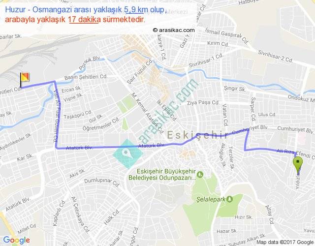 Huzur - Osmangazi arası yaklaşık olarak 90 km/h ile yukarıda belirtilen sürede olup, iki yerin kuş uçuşu uzaklığı (mesafesi) 4'dir. Yolculuk otobüsle 22 dakika sürmektedir.