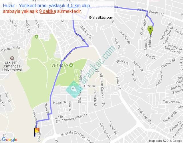 Huzur - Yenikent arası yaklaşık olarak 90 km/h ile yukarıda belirtilen sürede olup, iki yerin kuş uçuşu uzaklığı (mesafesi) 2'dir. Yolculuk otobüsle 11 dakika sürmektedir.