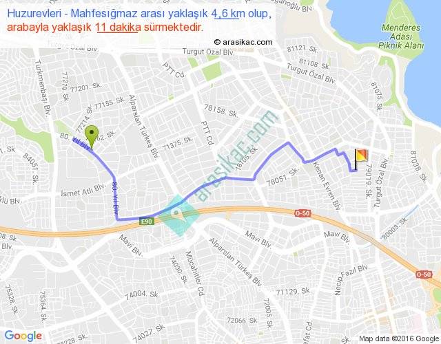 Huzurevleri - Mahfesığmaz arası yaklaşık olarak 90 km/h ile yukarıda belirtilen sürede olup, iki yerin kuş uçuşu uzaklığı (mesafesi) 3'dir. Yolculuk otobüsle 14 dakika sürmektedir.