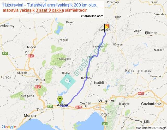 Huzurevleri - Tufanbeyli arası yaklaşık olarak 90 km/h ile yukarıda belirtilen sürede olup, iki yerin kuş uçuşu uzaklığı (mesafesi) 158'dir. Yolculuk otobüsle 4 saat 5 dakika sürmektedir.