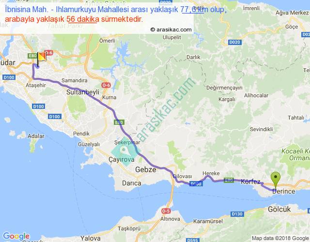 İbnisina Mah. - Ihlamurkuyu Mahallesi arası yaklaşık olarak 90 km/h ile yukarıda belirtilen sürede olup, iki yerin kuş uçuşu uzaklığı (mesafesi) 63'dir. Yolculuk otobüsle 1 saat 12 dakika sürmektedir.