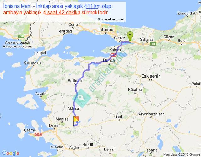 İbnisina Mah. - İnkılap arası yaklaşık olarak 90 km/h ile yukarıda belirtilen sürede olup, iki yerin kuş uçuşu uzaklığı (mesafesi) 299'dir. Eğer belirtilen yerler arasında uçak seferi var ise bu süre uçakla 27 dakika'ya kadar düşebilir. Yolculuk otobüsle 6 saat 6 dakika sürmektedir.