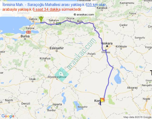 İbnisina Mah. - Saraçoğlu Mahallesi arası yaklaşık olarak 90 km/h ile yukarıda belirtilen sürede olup, iki yerin kuş uçuşu uzaklığı (mesafesi) 401'dir. Eğer belirtilen yerler arasında uçak seferi var ise bu süre uçakla 37 dakika'ya kadar düşebilir. Yolculuk otobüsle 8 saat 32 dakika sürmektedir.