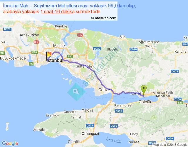 İbnisina Mah. - Seyitnizam Mahallesi arası yaklaşık olarak 90 km/h ile yukarıda belirtilen sürede olup, iki yerin kuş uçuşu uzaklığı (mesafesi) 80'dir. Yolculuk otobüsle 1 saat 38 dakika sürmektedir.