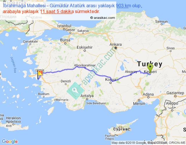 İbrahimağa Mahallesi - Gümüldür Atatürk arası yaklaşık olarak 90 km/h ile yukarıda belirtilen sürede olup, iki yerin kuş uçuşu uzaklığı (mesafesi) 737'dir. Eğer belirtilen yerler arasında uçak seferi var ise bu süre uçakla 1 saat 08 dakika'ya kadar düşebilir. Yolculuk otobüsle 14 saat 24 dakika sürmektedir.