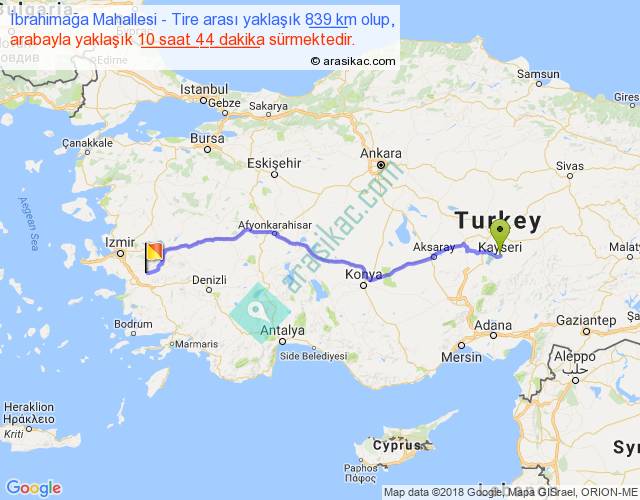 İbrahimağa Mahallesi - Tire arası yaklaşık olarak 90 km/h ile yukarıda belirtilen sürede olup, iki yerin kuş uçuşu uzaklığı (mesafesi) 674'dir. Eğer belirtilen yerler arasında uçak seferi var ise bu süre uçakla 1 saat 02 dakika'ya kadar düşebilir. Yolculuk otobüsle 13 saat 57 dakika sürmektedir.