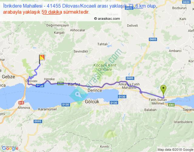 İbrikdere Mahallesi - 41455 Dilovası Kocaeli arası yaklaşık olarak 90 km/h ile yukarıda belirtilen sürede olup, iki yerin kuş uçuşu uzaklığı (mesafesi) 48'dir. Yolculuk otobüsle 1 saat 16 dakika sürmektedir.