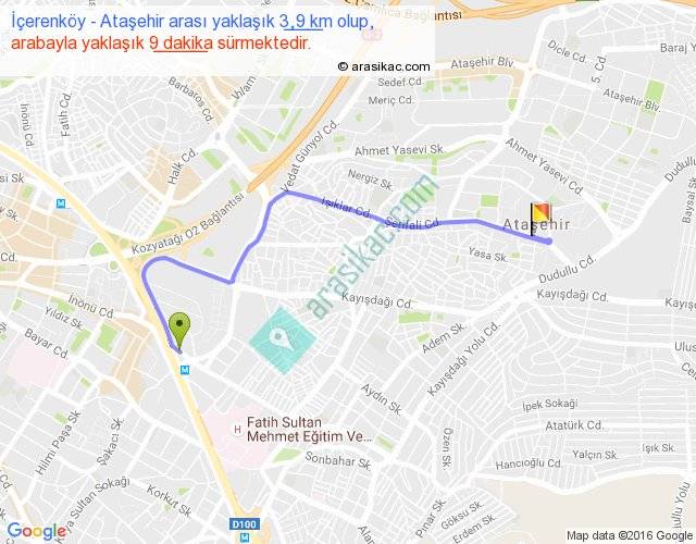 İçerenköy - Ataşehir arası yaklaşık olarak 90 km/h ile yukarıda belirtilen sürede olup, iki yerin kuş uçuşu uzaklığı (mesafesi) 2'dir. Yolculuk otobüsle 11 dakika sürmektedir.