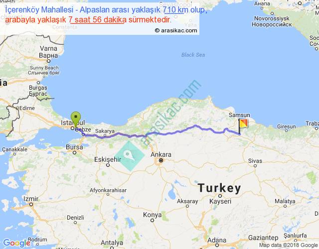 İçerenköy Mahallesi - Alpaslan arası yaklaşık olarak 90 km/h ile yukarıda belirtilen sürede olup, iki yerin kuş uçuşu uzaklığı (mesafesi) 604'dir. Eğer belirtilen yerler arasında uçak seferi var ise bu süre uçakla 55 dakika'ya kadar düşebilir. Yolculuk otobüsle 10 saat 18 dakika sürmektedir.