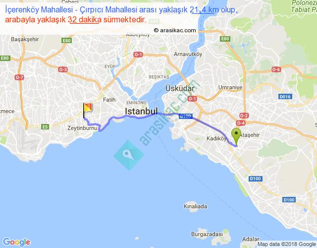 İçerenköy Mahallesi - Çırpıcı Mahallesi arası yaklaşık olarak 90 km/h ile yukarıda belirtilen sürede olup, iki yerin kuş uçuşu uzaklığı (mesafesi) 18'dir. Yolculuk otobüsle 41 dakika sürmektedir.