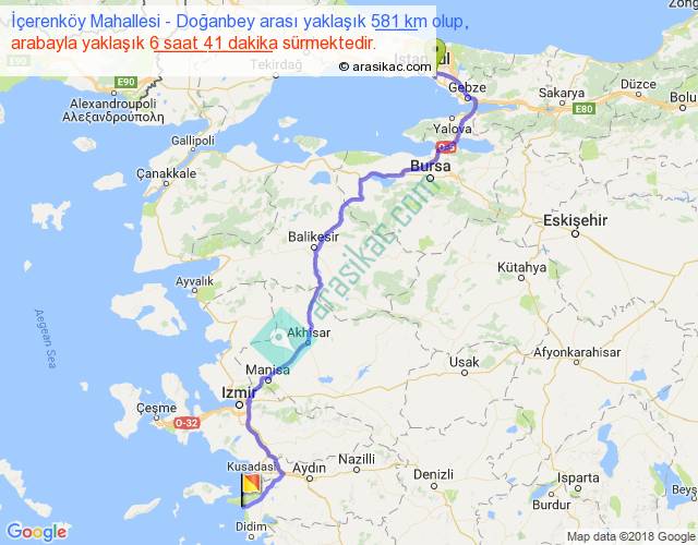 İçerenköy Mahallesi - Doğanbey arası yaklaşık olarak 90 km/h ile yukarıda belirtilen sürede olup, iki yerin kuş uçuşu uzaklığı (mesafesi) 406'dir. Eğer belirtilen yerler arasında uçak seferi var ise bu süre uçakla 37 dakika'ya kadar düşebilir. Yolculuk otobüsle 8 saat 41 dakika sürmektedir.