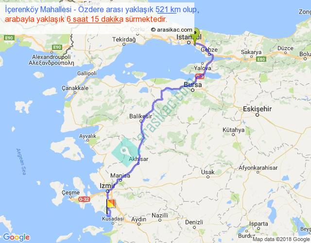 İçerenköy Mahallesi - Özdere arası yaklaşık olarak 90 km/h ile yukarıda belirtilen sürede olup, iki yerin kuş uçuşu uzaklığı (mesafesi) 367'dir. Eğer belirtilen yerler arasında uçak seferi var ise bu süre uçakla 33 dakika'ya kadar düşebilir. Yolculuk otobüsle 8 saat 7 dakika sürmektedir.