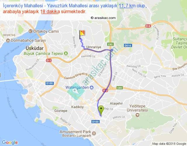 İçerenköy Mahallesi - Yavuztürk Mahallesi arası yaklaşık olarak 90 km/h ile yukarıda belirtilen sürede olup, iki yerin kuş uçuşu uzaklığı (mesafesi) 8'dir. Yolculuk otobüsle 23 dakika sürmektedir.