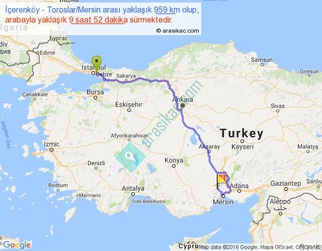İçerenköy - Toroslar Mersin arası yaklaşık olarak 90 km/h ile yukarıda belirtilen sürede olup, iki yerin kuş uçuşu uzaklığı (mesafesi) 628'dir. Eğer belirtilen yerler arasında uçak seferi var ise bu süre uçakla 57 dakika'ya kadar düşebilir. Yolculuk otobüsle 12 saat 49 dakika sürmektedir.
