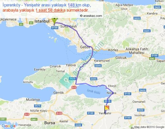 İçerenköy - Yenişehir arası yaklaşık olarak 90 km/h ile yukarıda belirtilen sürede olup, iki yerin kuş uçuşu uzaklığı (mesafesi) 91'dir. Yolculuk otobüsle 2 saat 33 dakika sürmektedir.