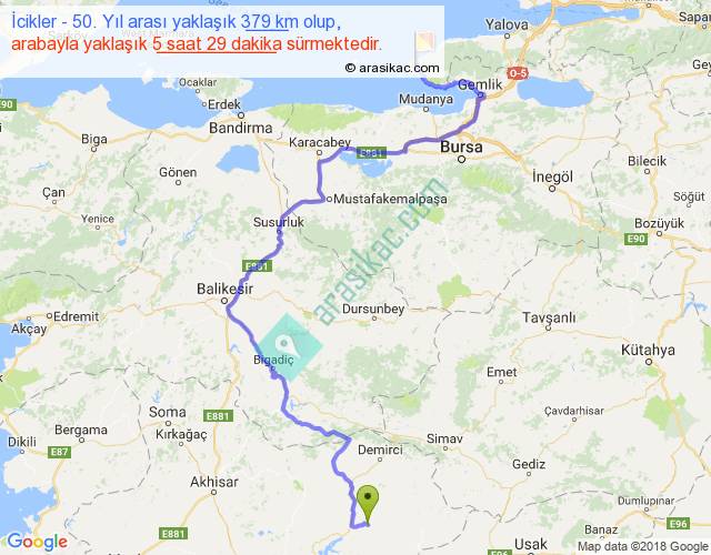 İcikler - 50. Yıl arası yaklaşık olarak 90 km/h ile yukarıda belirtilen sürede olup, iki yerin kuş uçuşu uzaklığı (mesafesi) 195'dir. Yolculuk otobüsle 7 saat 7 dakika sürmektedir.