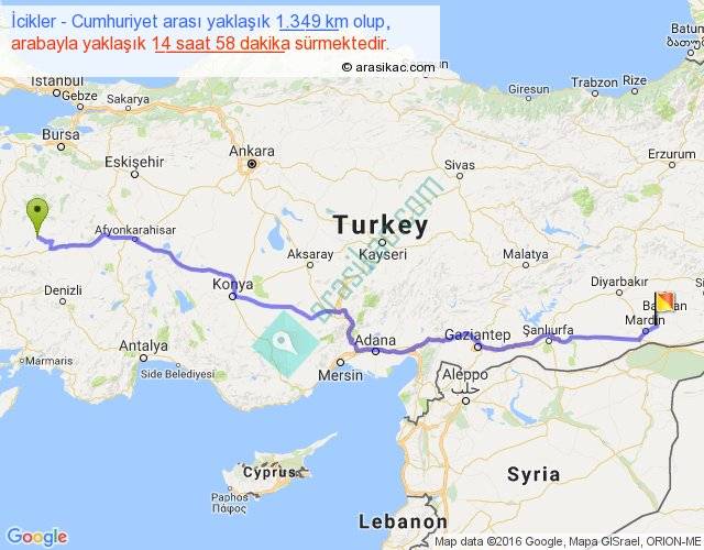 İcikler - Cumhuriyet arası yaklaşık olarak 90 km/h ile yukarıda belirtilen sürede olup, iki yerin kuş uçuşu uzaklığı (mesafesi) 1085'dir. Eğer belirtilen yerler arasında uçak seferi var ise bu süre uçakla 1 saat 40 dakika'ya kadar düşebilir. Yolculuk otobüsle 19 saat 27 dakika sürmektedir.