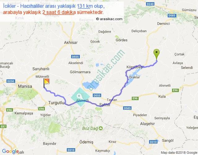 İcikler - Hacıhaliller arası yaklaşık olarak 90 km/h ile yukarıda belirtilen sürede olup, iki yerin kuş uçuşu uzaklığı (mesafesi) 89'dir. Yolculuk otobüsle 2 saat 43 dakika sürmektedir.