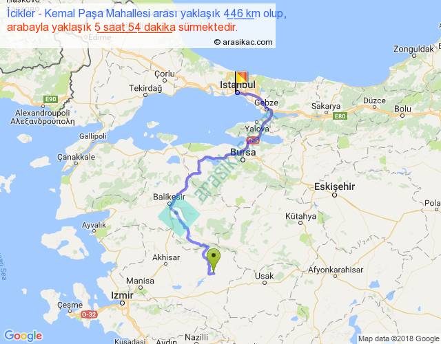 İcikler - Kemal Paşa Mahallesi arası yaklaşık olarak 90 km/h ile yukarıda belirtilen sürede olup, iki yerin kuş uçuşu uzaklığı (mesafesi) 247'dir. Yolculuk otobüsle 7 saat 40 dakika sürmektedir.