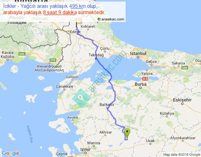 İcikler - Yağcılı arası yaklaşık olarak 90 km/h ile yukarıda belirtilen sürede olup, iki yerin kuş uçuşu uzaklığı (mesafesi) 363'dir. Eğer belirtilen yerler arasında uçak seferi var ise bu süre uçakla 33 dakika'ya kadar düşebilir. Yolculuk otobüsle 10 saat 35 dakika sürmektedir.