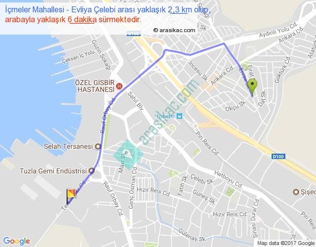 İçmeler Mahallesi - Evliya Çelebi arası yaklaşık olarak 90 km/h ile yukarıda belirtilen sürede olup, iki yerin kuş uçuşu uzaklığı (mesafesi) 2'dir. Yolculuk otobüsle 7 dakika sürmektedir.