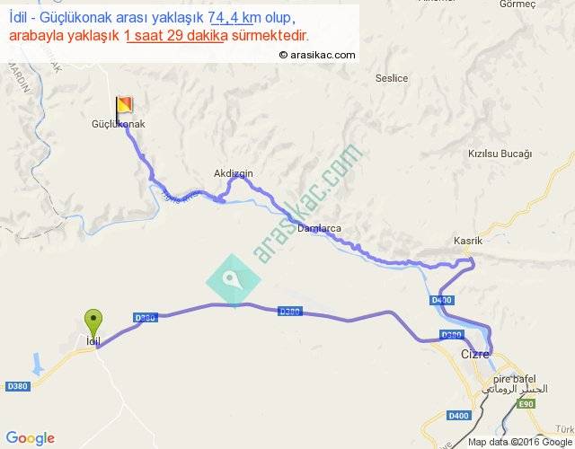 İdil - Güçlükonak arası yaklaşık olarak 90 km/h ile yukarıda belirtilen sürede olup, iki yerin kuş uçuşu uzaklığı (mesafesi) 15'dir. Yolculuk otobüsle 1 saat 55 dakika sürmektedir.