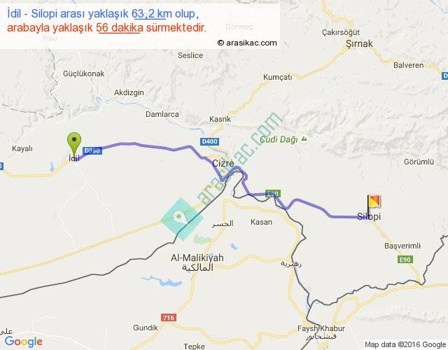 İdil - Silopi arası yaklaşık olarak 90 km/h ile yukarıda belirtilen sürede olup, iki yerin kuş uçuşu uzaklığı (mesafesi) 52'dir. Yolculuk otobüsle 1 saat 12 dakika sürmektedir.
