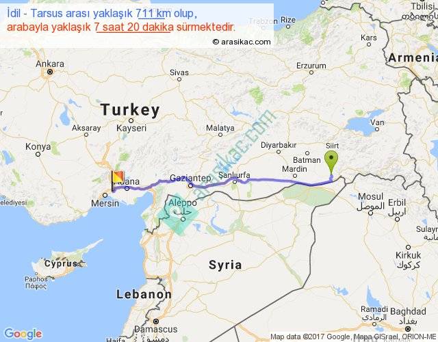 İdil - Tarsus arası yaklaşık olarak 90 km/h ile yukarıda belirtilen sürede olup, iki yerin kuş uçuşu uzaklığı (mesafesi) 618'dir. Eğer belirtilen yerler arasında uçak seferi var ise bu süre uçakla 57 dakika'ya kadar düşebilir. Yolculuk otobüsle 9 saat 32 dakika sürmektedir.