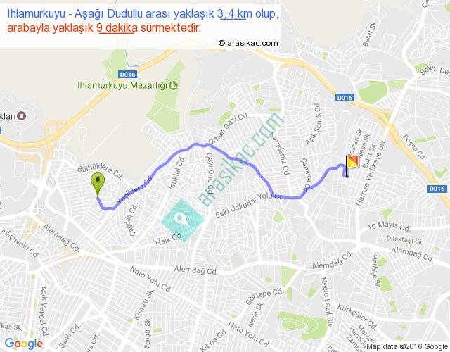 Ihlamurkuyu - Aşağı Dudullu arası yaklaşık olarak 90 km/h ile yukarıda belirtilen sürede olup, iki yerin kuş uçuşu uzaklığı (mesafesi) 3'dir. Yolculuk otobüsle 11 dakika sürmektedir.