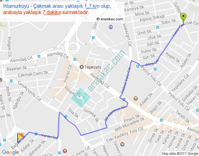 Ihlamurkuyu - Çakmak arası yaklaşık olarak 90 km/h ile yukarıda belirtilen sürede olup, iki yerin kuş uçuşu uzaklığı (mesafesi) 1'dir. Yolculuk otobüsle 9 dakika sürmektedir.