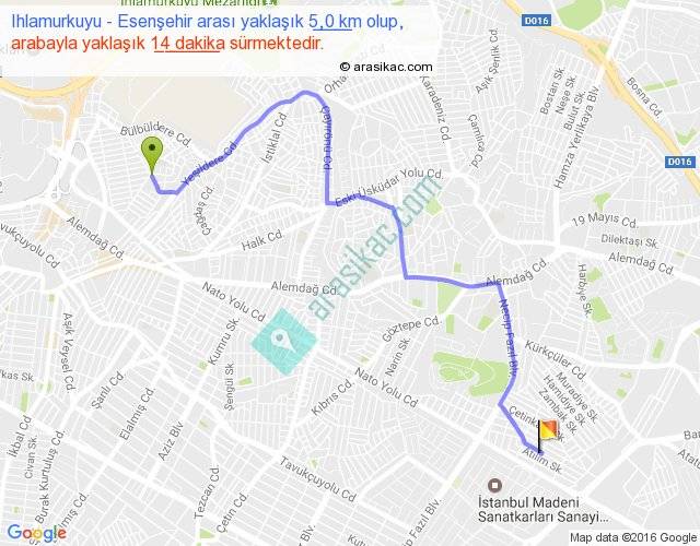 Ihlamurkuyu - Esenşehir arası yaklaşık olarak 90 km/h ile yukarıda belirtilen sürede olup, iki yerin kuş uçuşu uzaklığı (mesafesi) 3'dir. Yolculuk otobüsle 18 dakika sürmektedir.