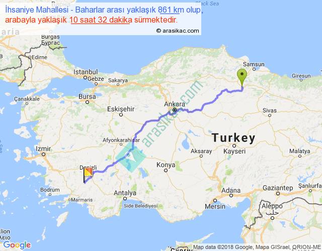 İhsaniye Mahallesi - Baharlar arası yaklaşık olarak 90 km/h ile yukarıda belirtilen sürede olup, iki yerin kuş uçuşu uzaklığı (mesafesi) 690'dir. Eğer belirtilen yerler arasında uçak seferi var ise bu süre uçakla 1 saat 03 dakika'ya kadar düşebilir. Yolculuk otobüsle 13 saat 41 dakika sürmektedir.