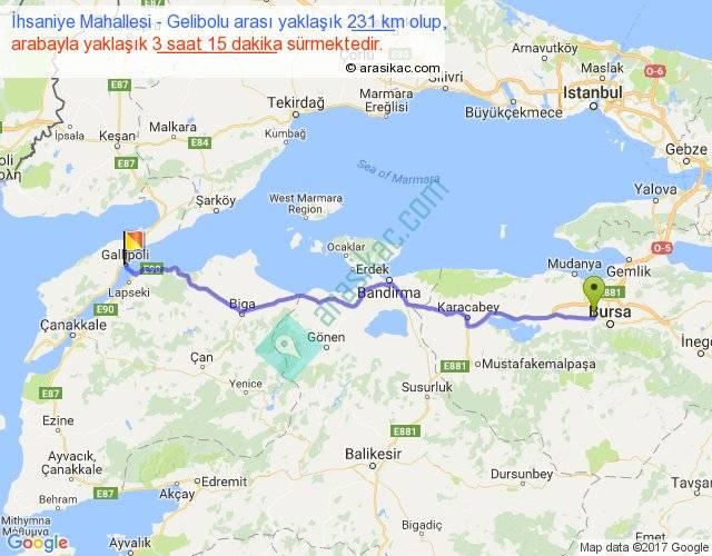İhsaniye Mahallesi - Gelibolu arası yaklaşık olarak 90 km/h ile yukarıda belirtilen sürede olup, iki yerin kuş uçuşu uzaklığı (mesafesi) 196'dir. Yolculuk otobüsle 4 saat 13 dakika sürmektedir.