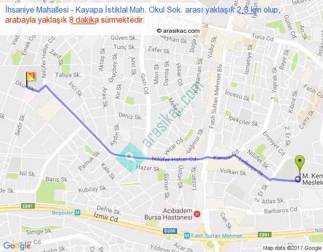İhsaniye Mahallesi - Kayapa İstiklal Mah. Okul Sok. arası yaklaşık olarak 90 km/h ile yukarıda belirtilen sürede olup, iki yerin kuş uçuşu uzaklığı (mesafesi) 2'dir. Yolculuk otobüsle 10 dakika sürmektedir.
