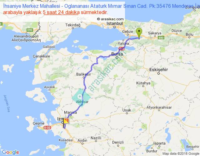 İhsaniye Merkez Mahallesi - Oglananası Ataturk Mımar Sınan Cad. Pk:35476 Menderes İzmir arası yaklaşık olarak 90 km/h ile yukarıda belirtilen sürede olup, iki yerin kuş uçuşu uzaklığı (mesafesi) 349'dir. Eğer belirtilen yerler arasında uçak seferi var ise bu süre uçakla 32 dakika'ya kadar düşebilir. Yolculuk otobüsle 7 saat 1 dakika sürmektedir.