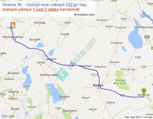 İhsaniye Sk. - Gazlıgöl arası yaklaşık olarak 90 km/h ile yukarıda belirtilen sürede olup, iki yerin kuş uçuşu uzaklığı (mesafesi) 297'dir. Eğer belirtilen yerler arasında uçak seferi var ise bu süre uçakla 27 dakika'ya kadar düşebilir. Yolculuk otobüsle 5 saat 12 dakika sürmektedir.