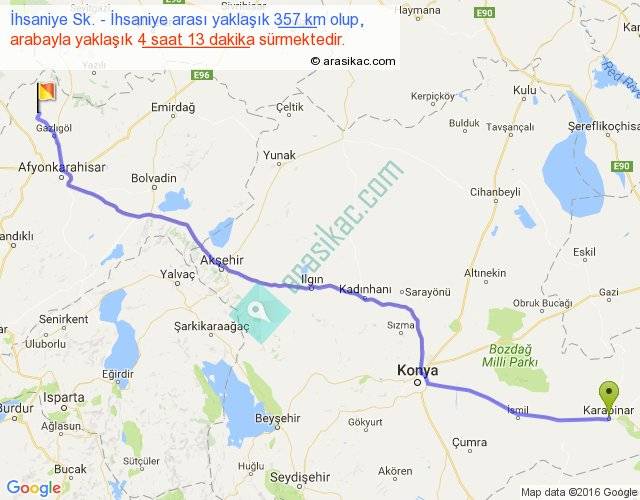 İhsaniye Sk. - İhsaniye arası yaklaşık olarak 90 km/h ile yukarıda belirtilen sürede olup, iki yerin kuş uçuşu uzaklığı (mesafesi) 307'dir. Eğer belirtilen yerler arasında uçak seferi var ise bu süre uçakla 28 dakika'ya kadar düşebilir. Yolculuk otobüsle 5 saat 28 dakika sürmektedir.