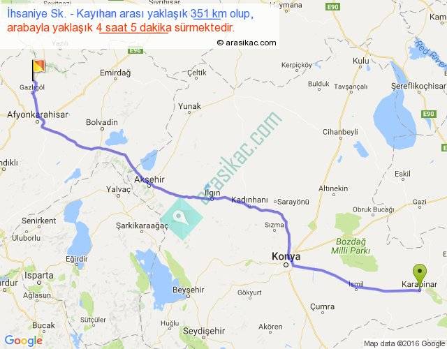 İhsaniye Sk. - Kayıhan arası yaklaşık olarak 90 km/h ile yukarıda belirtilen sürede olup, iki yerin kuş uçuşu uzaklığı (mesafesi) 299'dir. Eğer belirtilen yerler arasında uçak seferi var ise bu süre uçakla 27 dakika'ya kadar düşebilir. Yolculuk otobüsle 5 saat 18 dakika sürmektedir.