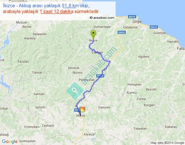 İkizce - Akkuş arası yaklaşık olarak 90 km/h ile yukarıda belirtilen sürede olup, iki yerin kuş uçuşu uzaklığı (mesafesi) 30'dir. Yolculuk otobüsle 1 saat 33 dakika sürmektedir.