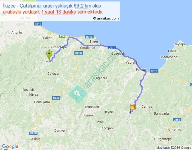 İkizce - Çatalpınar arası yaklaşık olarak 90 km/h ile yukarıda belirtilen sürede olup, iki yerin kuş uçuşu uzaklığı (mesafesi) 37'dir. Yolculuk otobüsle 1 saat 34 dakika sürmektedir.