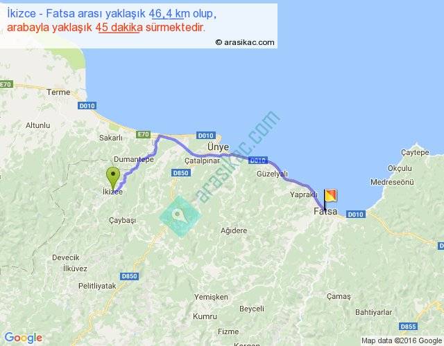 İkizce - Fatsa arası yaklaşık olarak 90 km/h ile yukarıda belirtilen sürede olup, iki yerin kuş uçuşu uzaklığı (mesafesi) 35'dir. Yolculuk otobüsle 58 dakika sürmektedir.